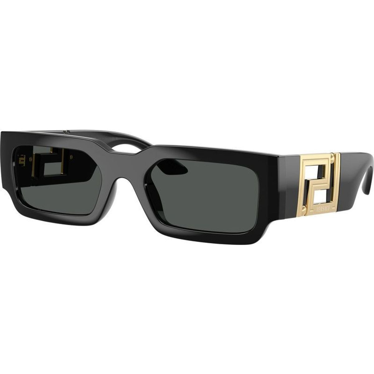 The men's Versace VE4506U sunglasses boast a striking balance of minimal shape and commanding presence. Daring yet elegant, this exceptional rectangular silhouette is the ultimate statement piece for those who appreciate refined design with a modern edge. The chunky black acetate construction is enhacned with substantial temples, adorned with Versace's signature cut-out Greca pattern for a bold finish. Paired with dark grey lenses, the VE4506U sunglasses help cut out harsh UV rays while ensuring a polished finish to your ensemble.