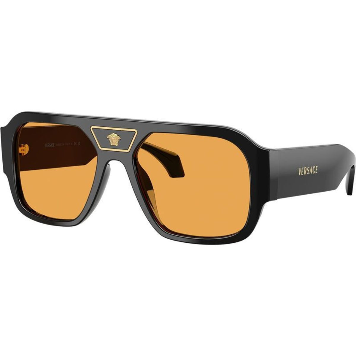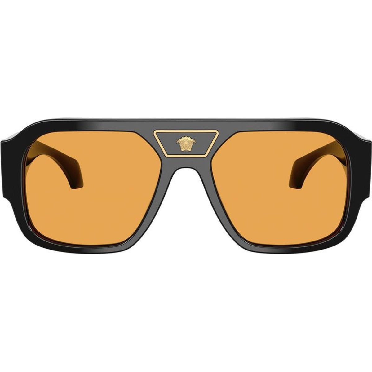 Make a bold yet effortlessly chic statement with the men's Versace VE4508U sunglasses. Showcasing an oversized navigator silhouette, this design is elevated by ultra-wide temples and signature third-eye detailing that exudes confidence and unmistakable Versace allure. Crafted in classic black and paired with vibrant orange lenses, the VE4508U adds a sophisticated pop of colour, bringing a polished, fashion-forward edge to any ensemble.